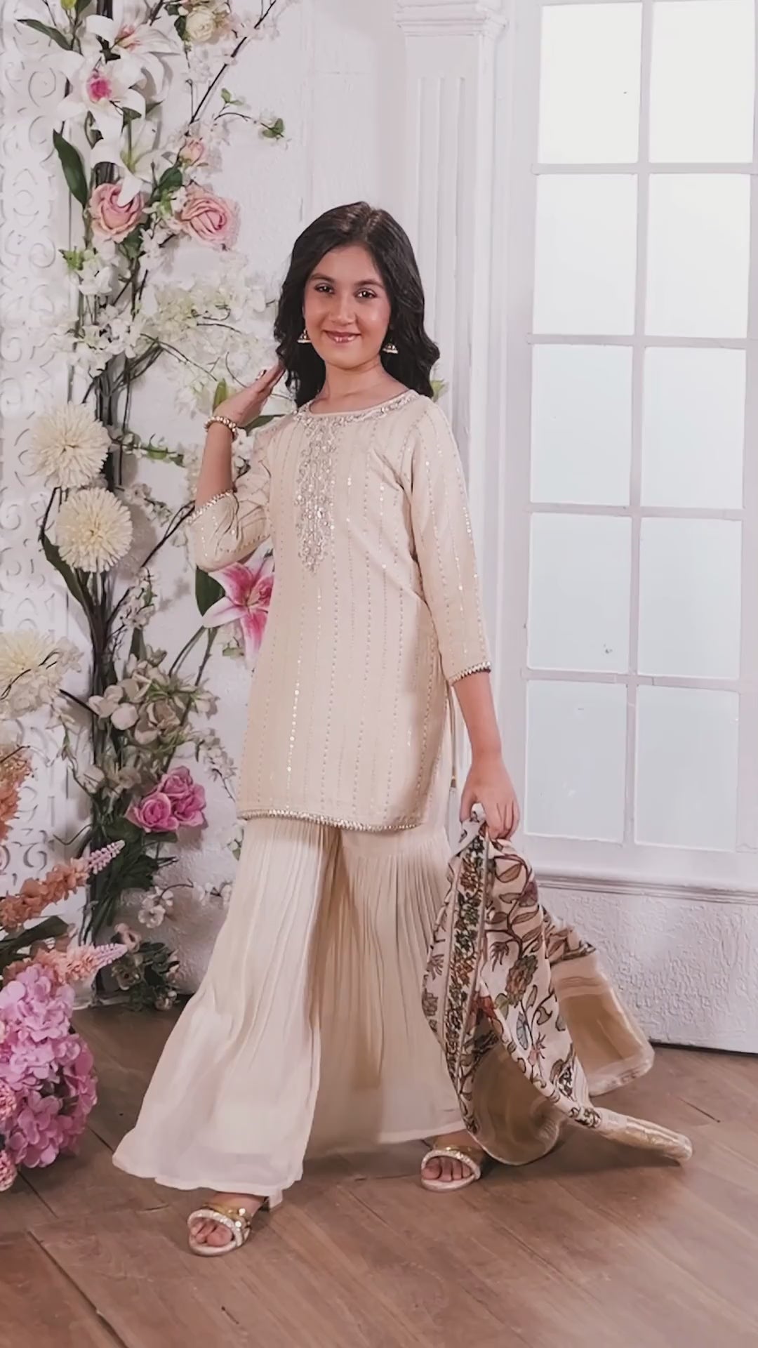 Cream Embroidered Kurta with Palazzo & Printed Dupatta