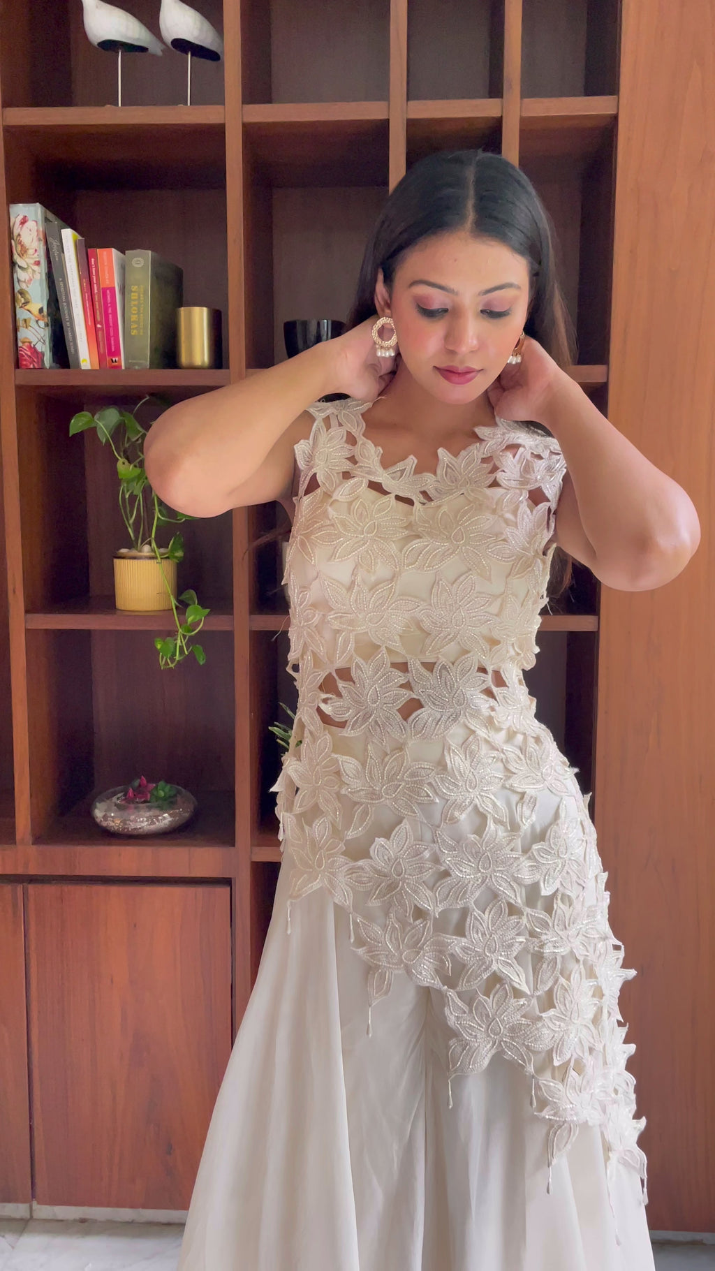 - Style: Asymmetrical sleeveless top with 3D floral appliques, paired with flowy ivory palazzo pants for a chic and comfortable look.