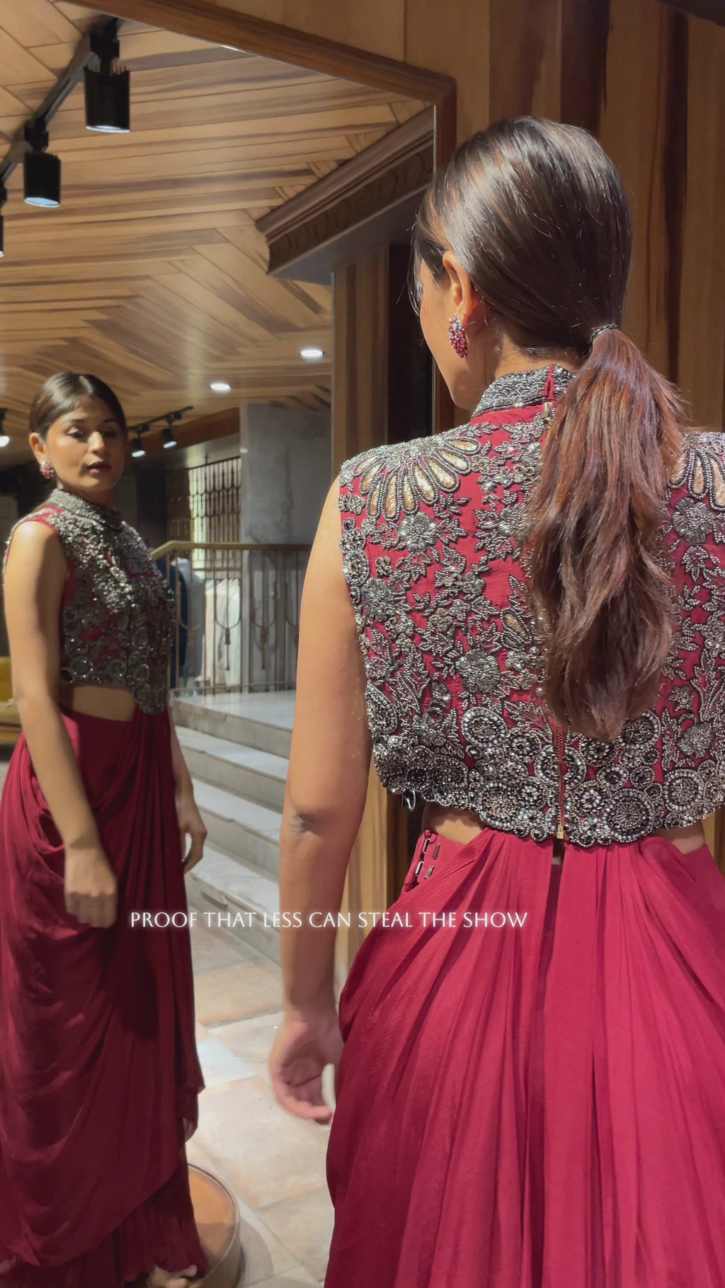 Perfect for cocktail nights, festive gatherings, and modern celebratory events, this maroon silk set is crafted for those who appreciate statement design with artisanal finesse.