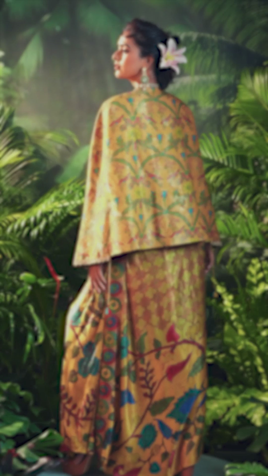 Bottom: Mustard tissue silk skirt with vibrant botanical patterns