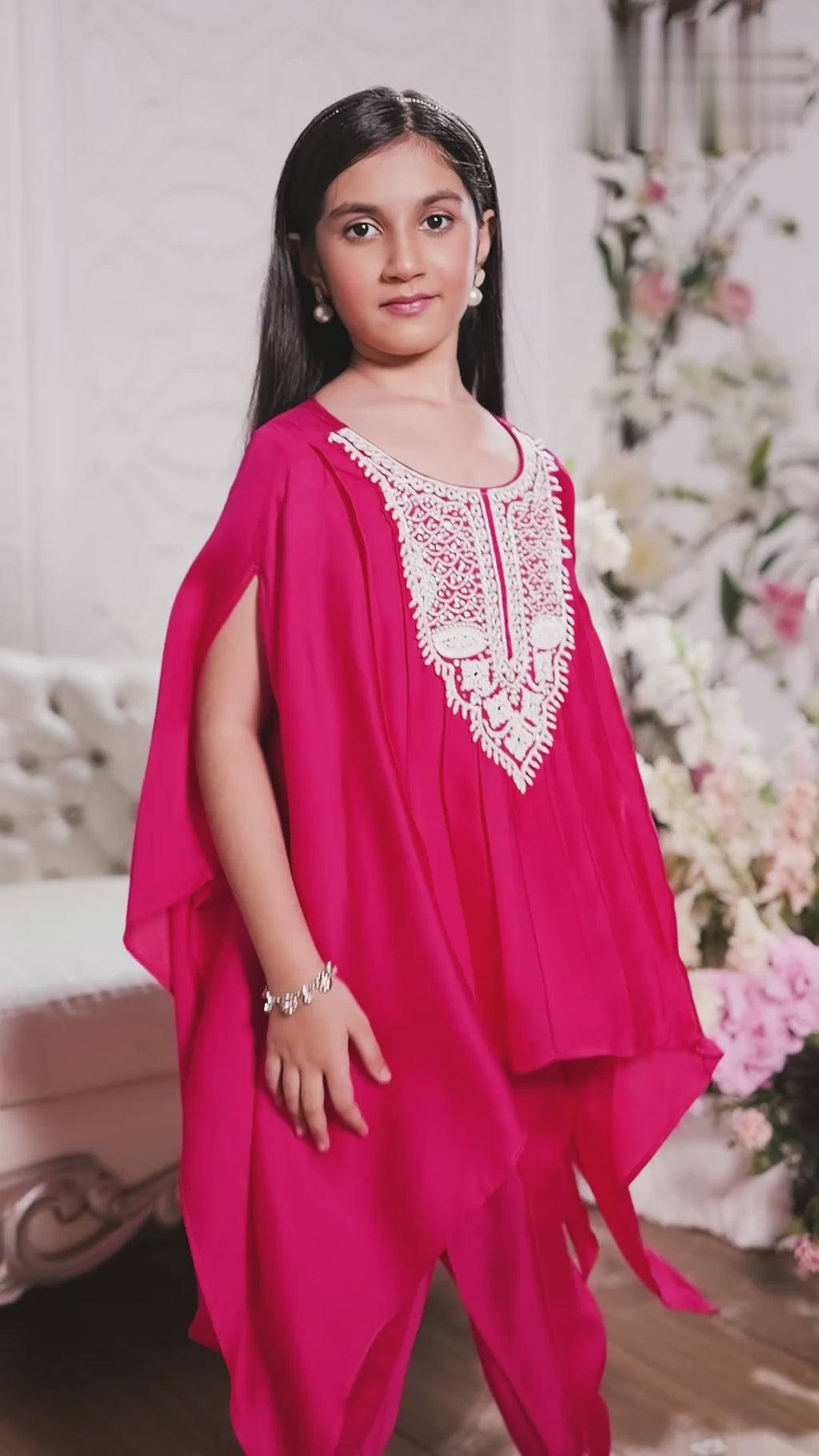 Give your little one a chic and festive look with this rani pink cape-style top and dhoti pant set. The top is tailored in premium satin fabric, designed with a flowy asymmetric silhouette that drapes gracefully on the sides. It features stunning white thread and mirror embroidery around the neckline, adding a touch of sparkle and sophistication. The intricate handwork beautifully complements the vibrant rani hue, making it ideal for festive occasions.