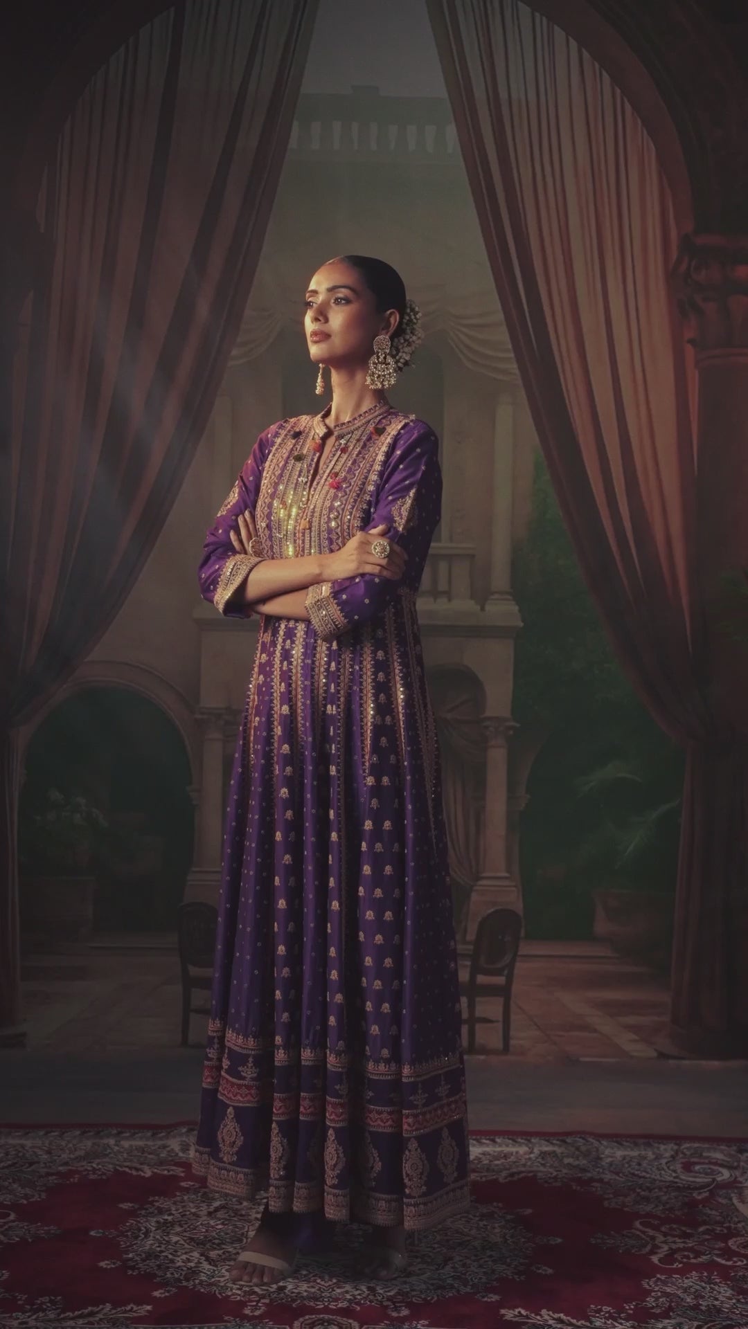 This majestic purple Anarkali set is crafted from exquisite silk and features intricate gold zari, sequins, pearls, and thread embroidery throughout. The flowing kurta is paired with straight-fit pants and complemented by a matching embroidered organza dupatta, making it a perfect ensemble for festive or traditional celebrations.