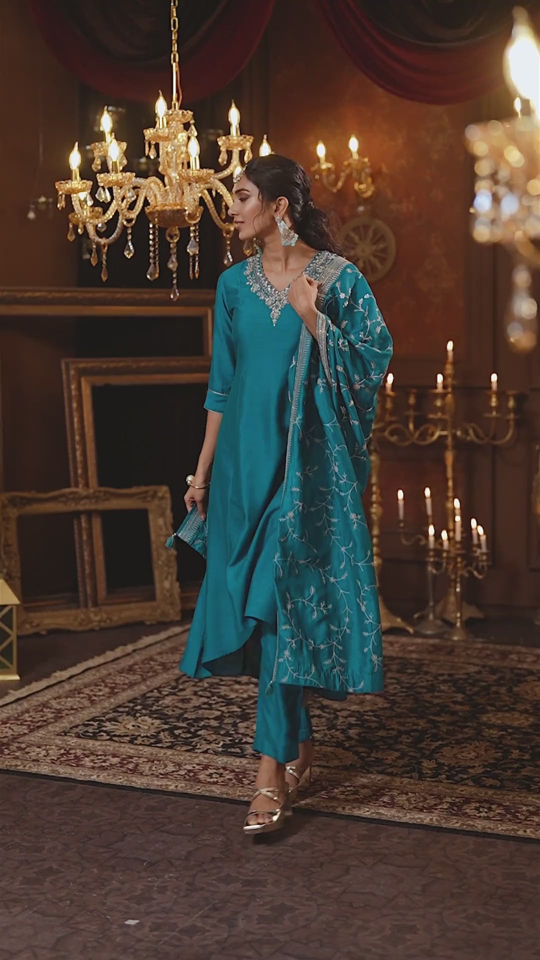 Elevate your festive wardrobe with this elegant teal silk short Anarkali set, featuring refined embroidery on the neckline and a beautifully detailed dupatta. Designed for graceful celebrations, this ensemble blends traditional charm with effortless sophistication.