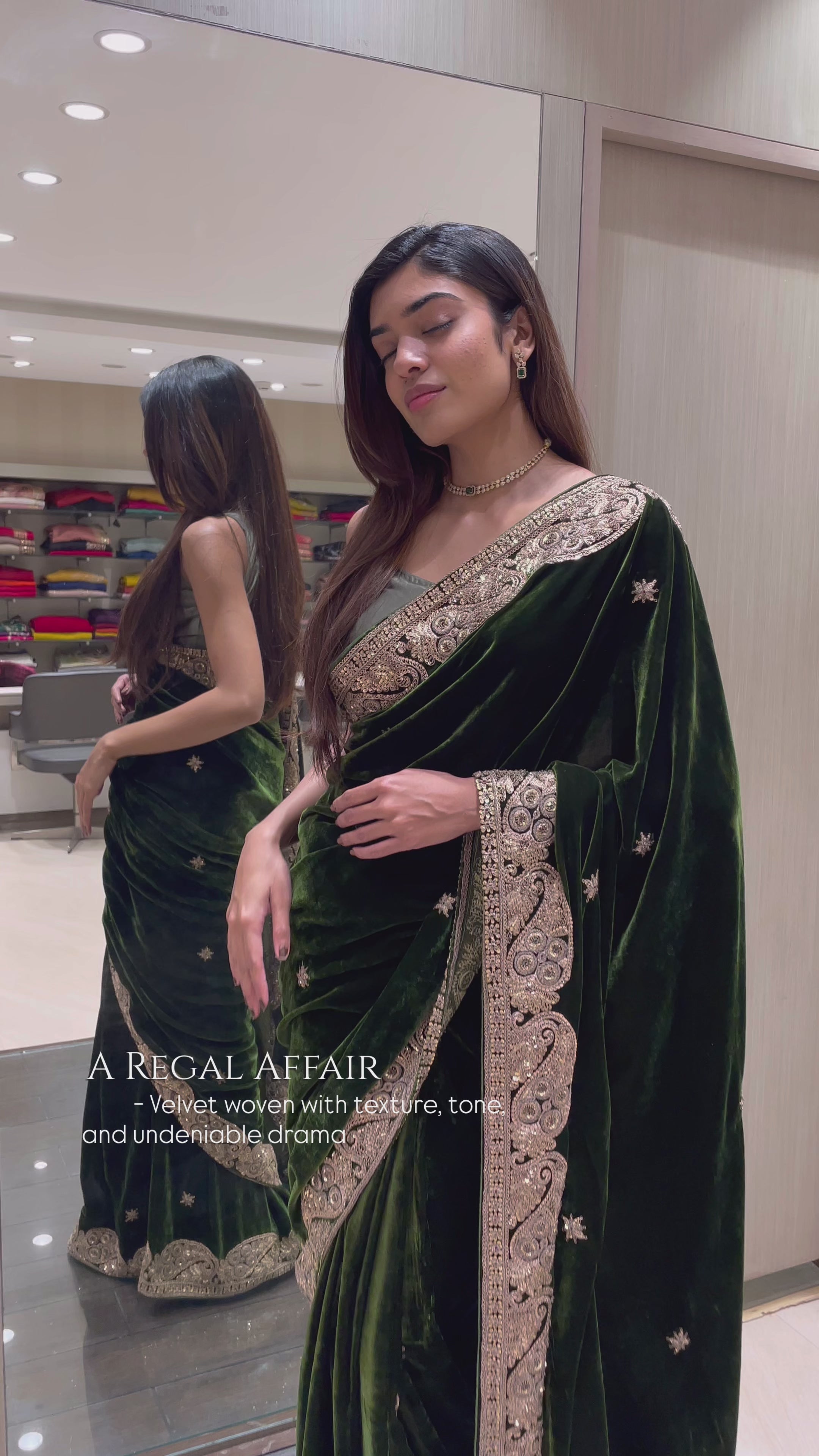 Rich in texture and detail, this velvet saree is a statement piece for those who appreciate grandeur woven with fine craftsmanship.